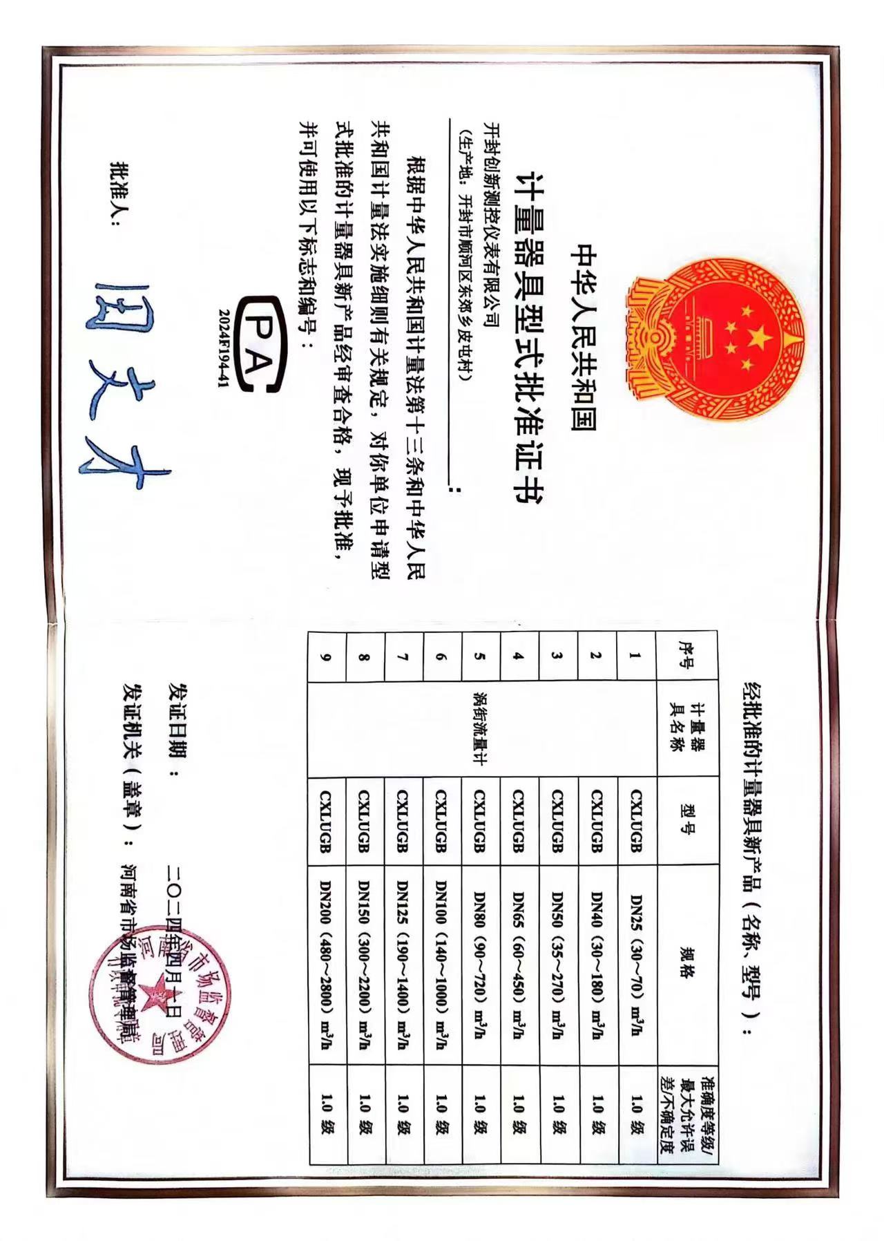 電磁流量計(jì)型批證書